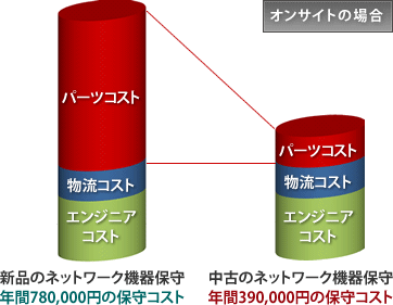 通常行われている新品のネットワーク機器を使った保守サービスに対し、弊社は保守に中古ネットワーク機器を使い、より低コストの保守サービスをご提供します。